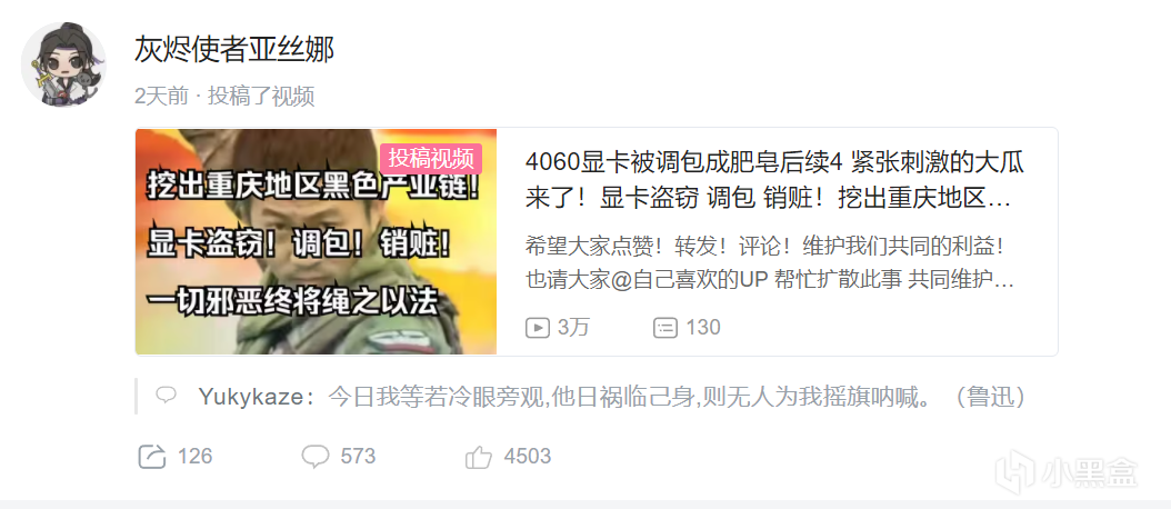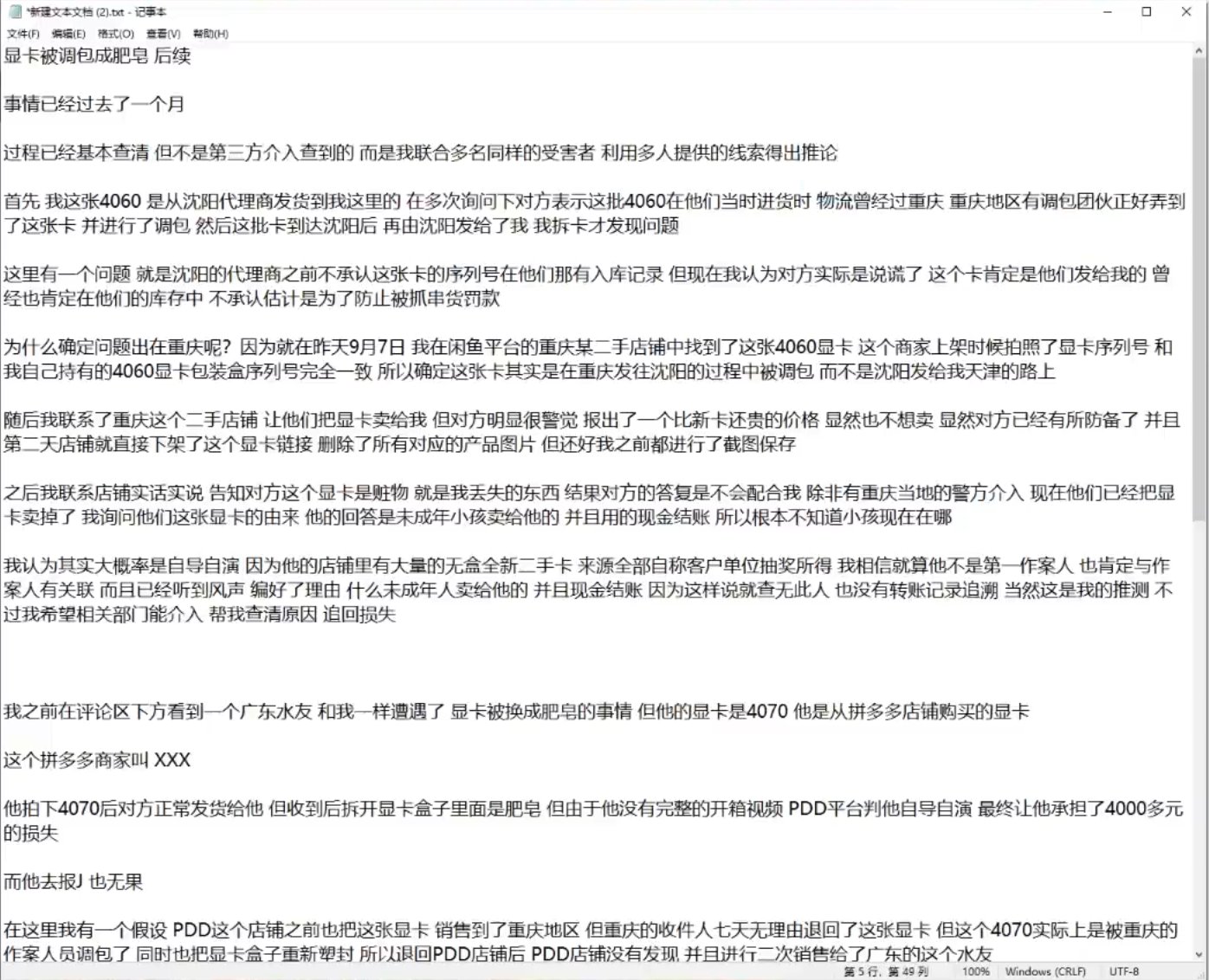 9月7日,該UP再次發表視頻表示自己在閒魚上的重慶某二手店鋪上找到了被偷換的RTX 4060顯卡,經查顯卡上的SN碼與自己包裝盒上的完全一致。UP主確認是顯卡由重慶發往瀋陽途中被掉包。後up主告知對方是贓物,但商家很警覺,在詢價之後就刪掉了鏈接和商品圖。稱是一位未成年小孩賣給他的。