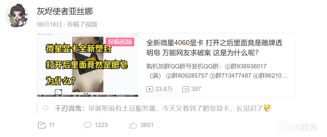 評論區有網友聲稱有同樣經歷:在拼多多某店鋪下單4070顯卡,而後被掉包成肥皂。由於沒有開箱視頻,只能單方面承擔4000塊損失。