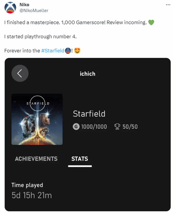 Xbox玩家@Niko Mueller在社交媒體上分享了成就,他宣佈成功解鎖了《星空(Starfield)》中的所有50項成就,總計達到1000成就分。這一壯舉耗費了他整整5天15小時的時間,總計達到了135小時的遊戲時間。
