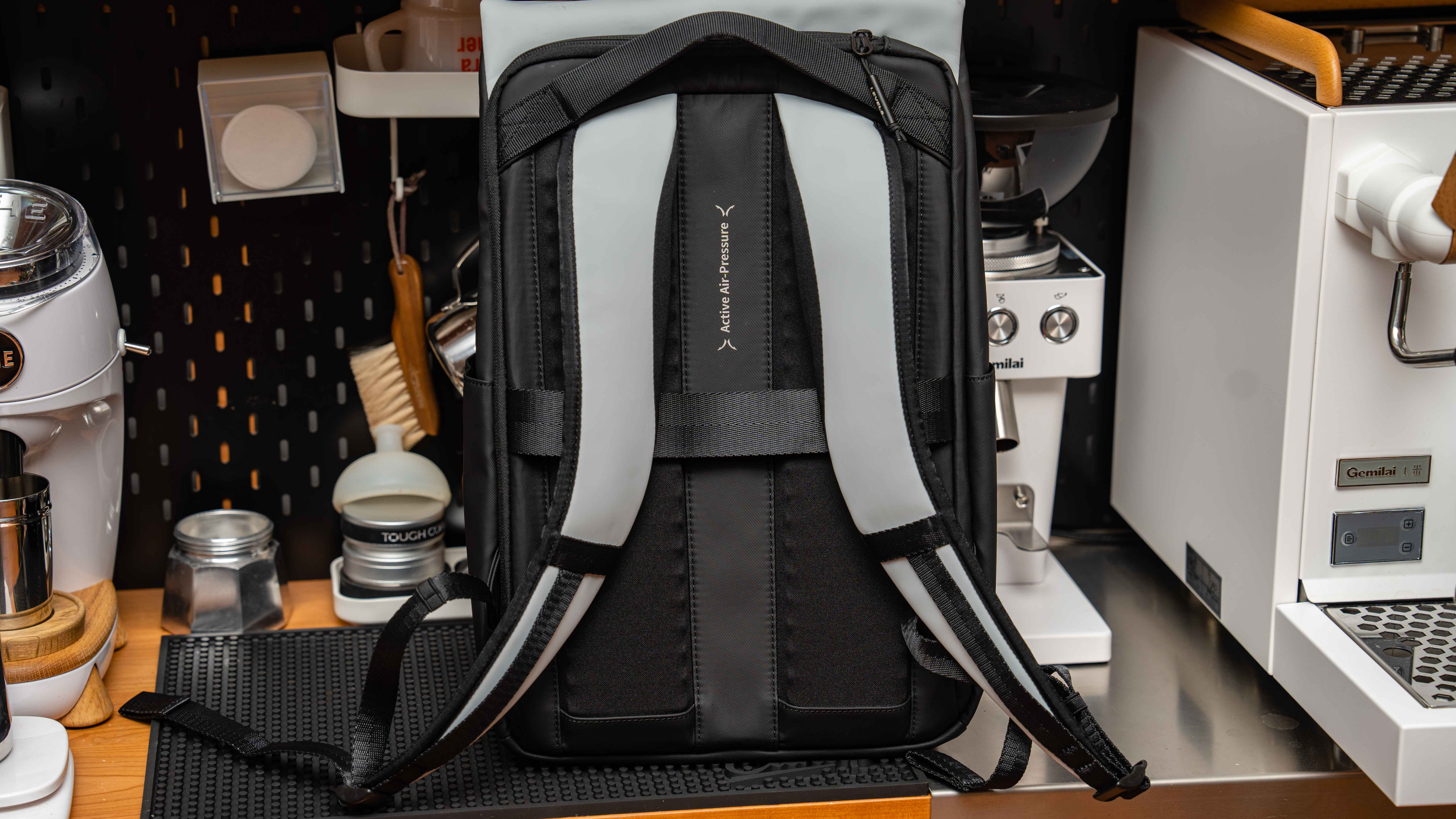 实际背起来,背后有空气导流设计和一体成型的冷压版,肩带S型曲线分散压力也有eva硅胶垫填充设计,能够最大程度减少背后不透气的情况,包的背负重心设计的也很到位,背起来腰背压力不算大,还有适配拉杆箱的带子,方便挂在箱子上。