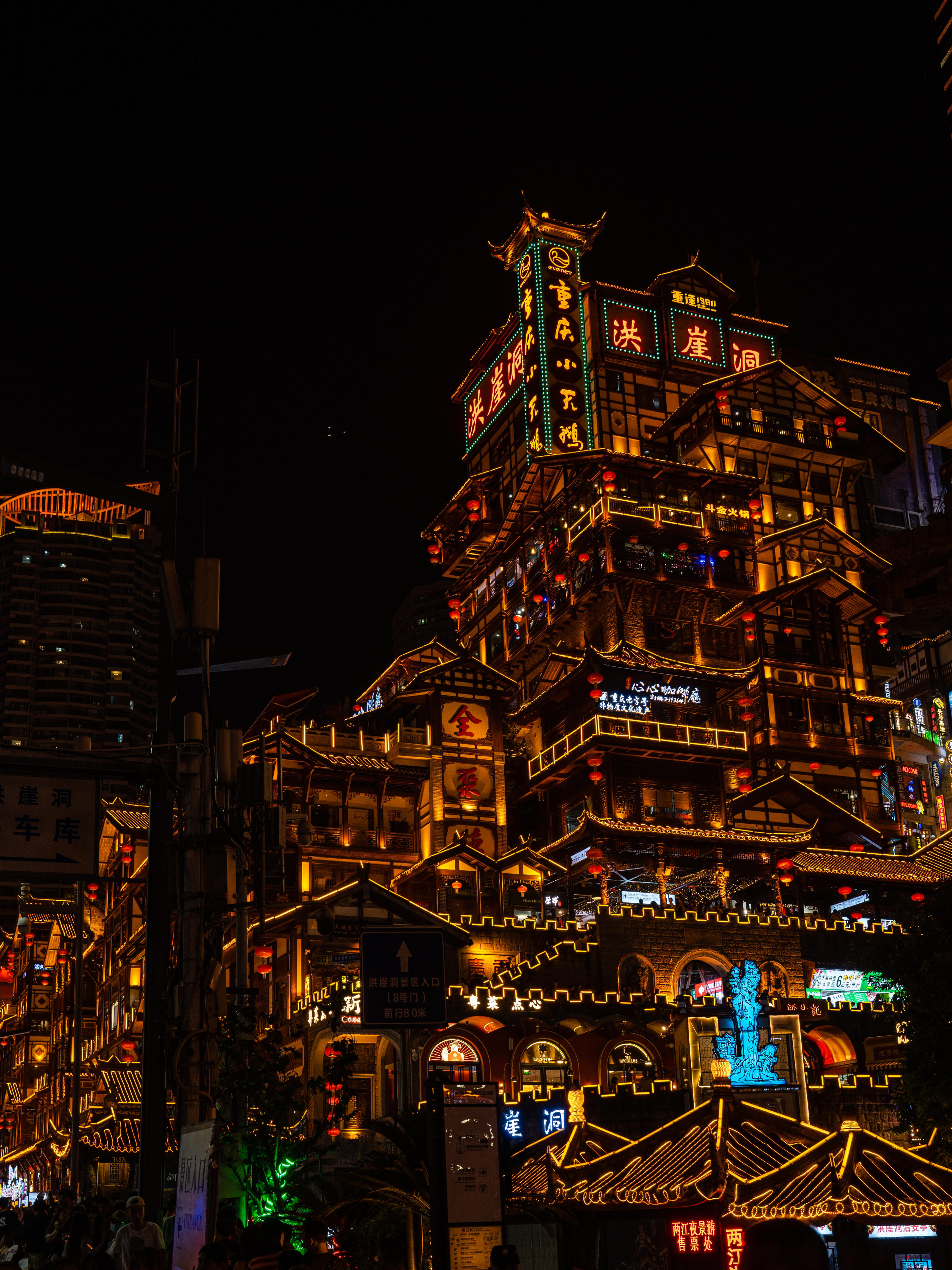 开灯的效果是这样,洪崖洞就是个拍照的地方,人巨多,建议别在这买任何东西,直接从上面坐电梯到底层,走到天桥拍点照片就行了,有条件的可以带闪光灯拍,下面全是30元拍照的人,角度大家可以去搜搜,其实有相机的都不难拍。