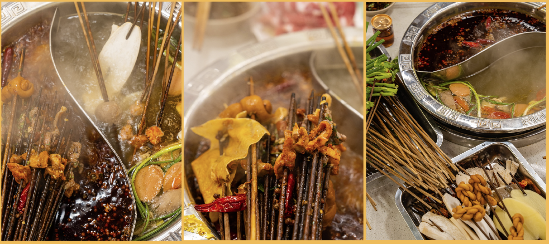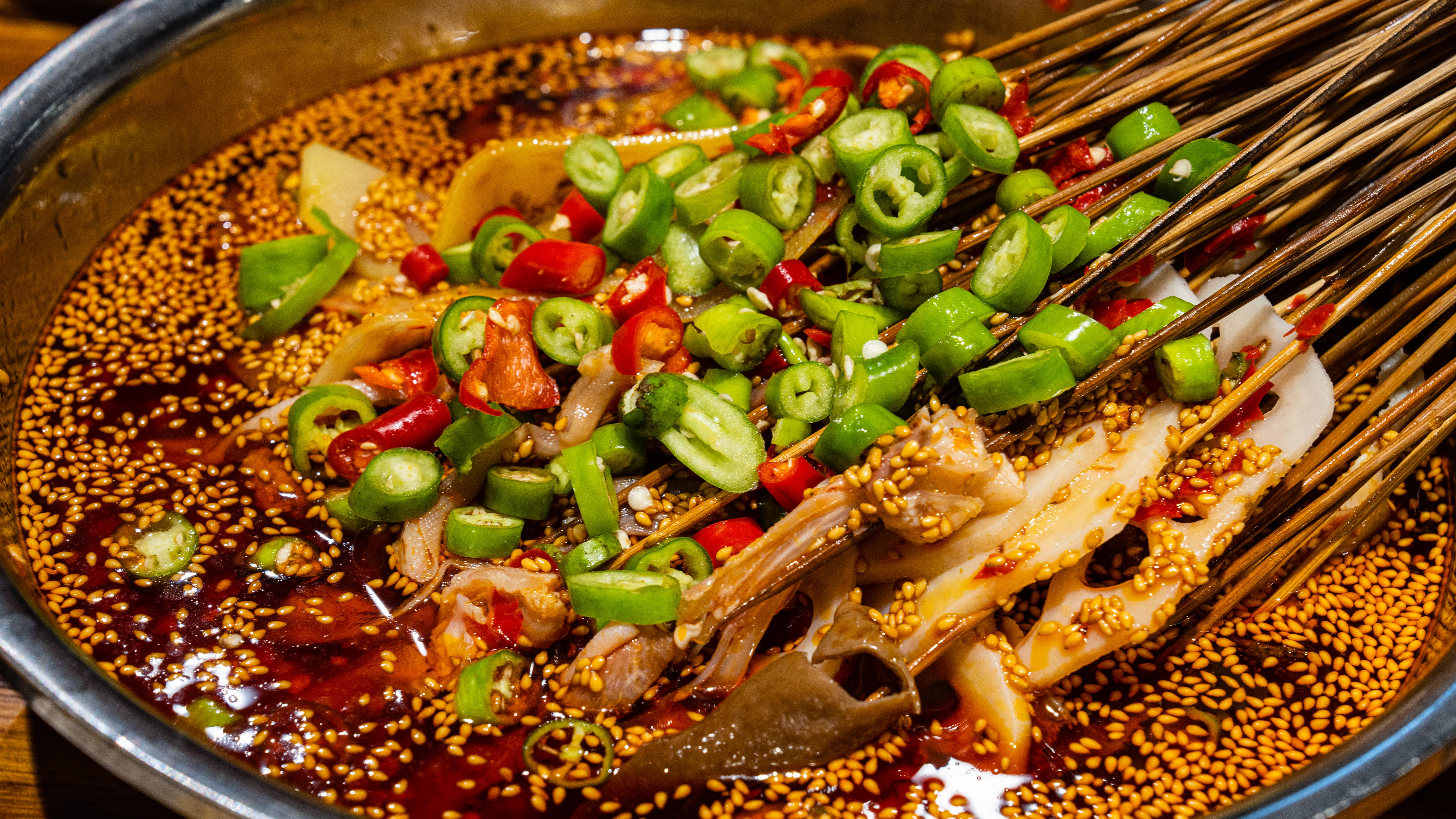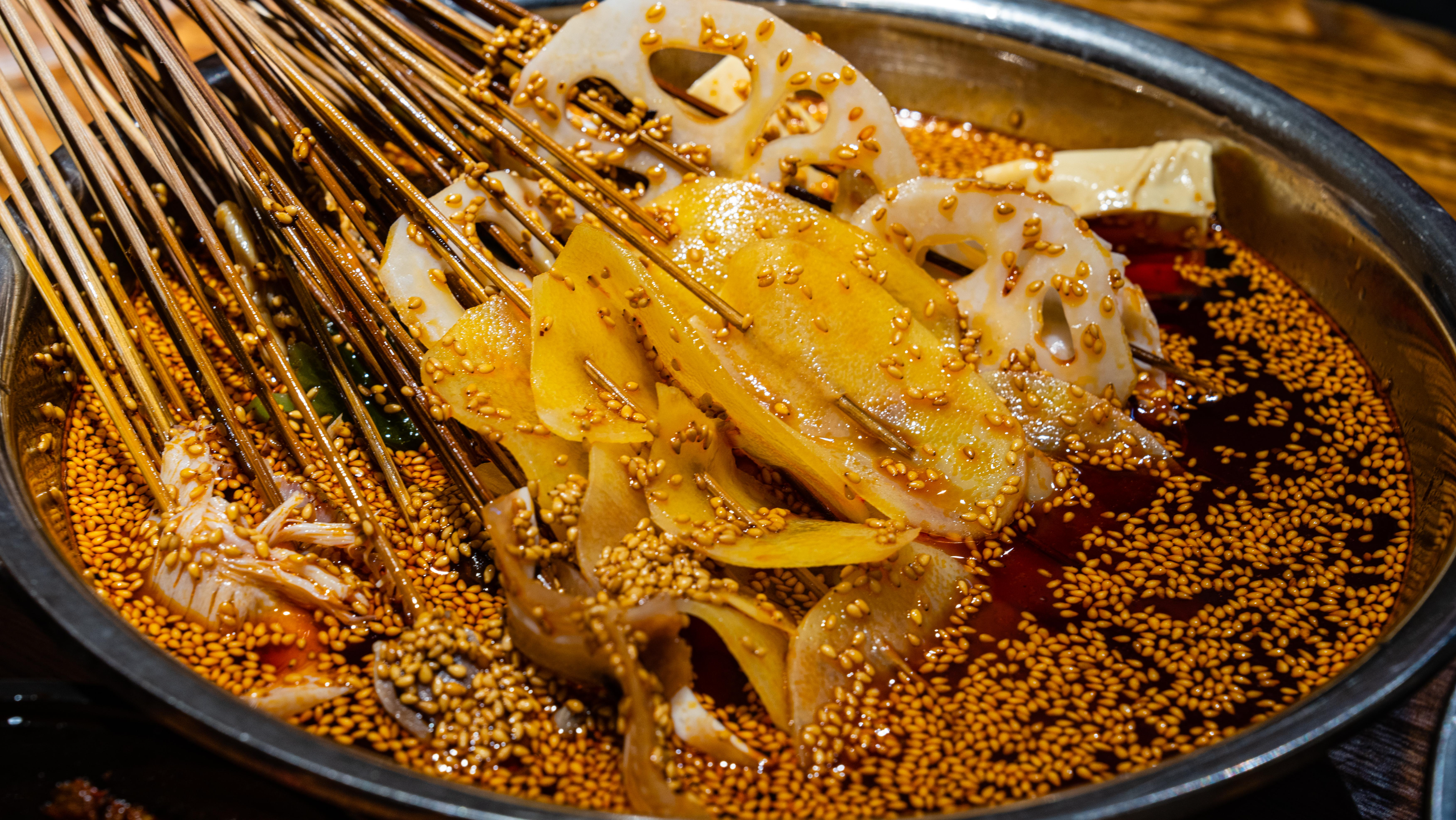 钵钵鸡的汤底看起来口味非常重,实际上没有很辣很咸,还有点微甜,他家香辣和麻椒是热门口味,上菜巨快,2分钟就上来了。