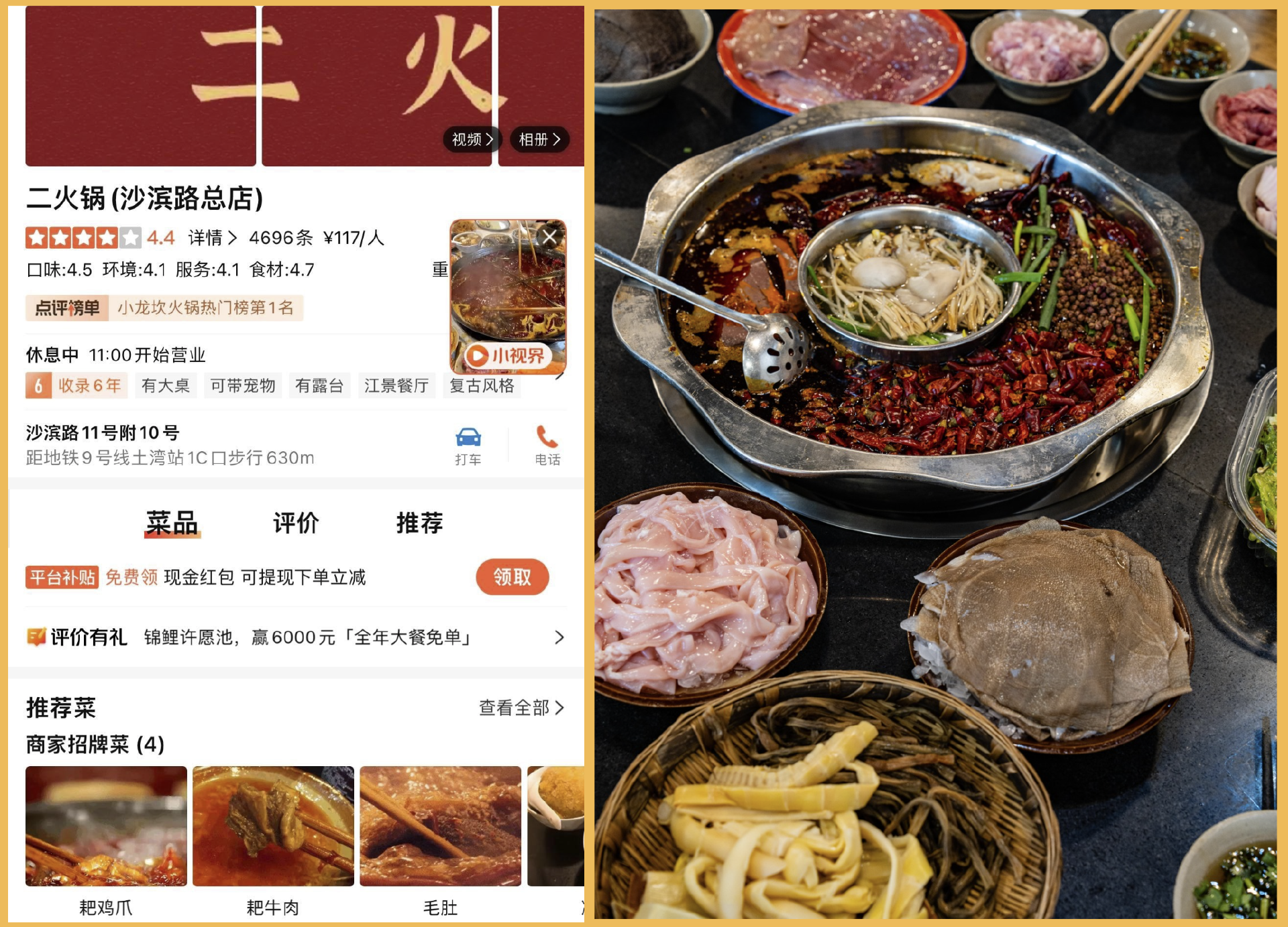 二火锅也有很多分店,也是本地人介绍的,我理解本地人推荐的火锅一般都是他们住处附近的,我五点去的还没排队,吃着吃着就开始排队了,这家味道不错,非常辣,菜也都很新鲜,但桌子没有摆在外面,听口音本地人挺多。
