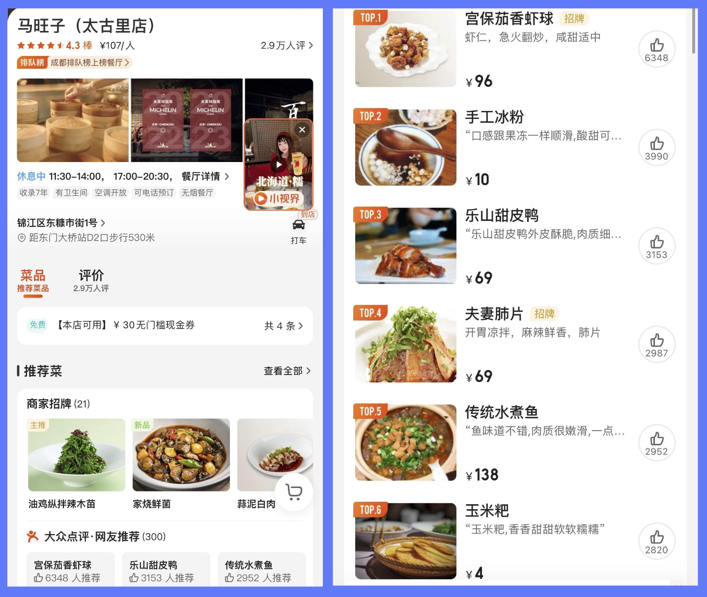 这家我本来没打算去,逛太古里看到排长队,甚至还有黄牛卖票(30-50),我就顺手拿了号,逛完回来发现还可以吃,就去尝试了下,这家之前上过米其林,味道不差,但价格不便宜,环境非常好,逛街顺路可以试试,挺有特点但应该代表不了川菜,光太古里的话可以去提前拿个号,逛完去吃。