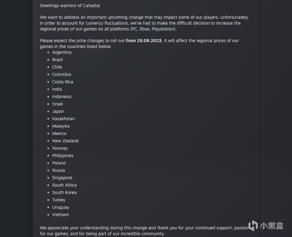 游戏将于9月19号开始,在超过20个区域涨价,其中包括阿区、土区、俄区等低价区,但没有国区。
