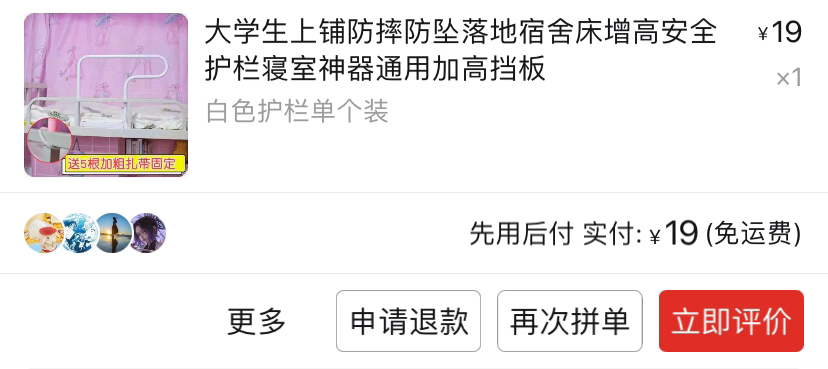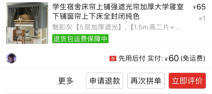 总共花费一百左右,但装会费点劲儿,并且需要一个圆杆来拉动床帘(我的圆杆是室友原来剩下的,圆杆就类似于家里蚊帐用的支撑杆,金属的塑料的都可以,不要太粗)