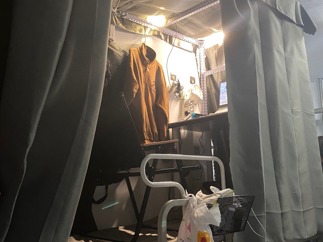 床帘是一个很好用的东西,可以在宿舍里面给自己提供一些私密性,并且如果平常很晚才关宿舍灯,遮光性良好的床帘可以保证自己的睡眠。楼主的宿舍层高相对较高,上铺的空间足足有1.5m靠上,所以可以将床帘放的更高。