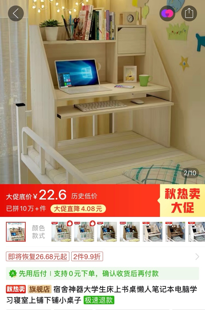 由于楼主大一大二已经体验过普通床上桌的痛苦与憋屈(楼主身高187,下铺高度只有1m),所以这次上铺1.5m打算充分利用,并且不再用普通的床上桌(晚上睡觉不老实,一抬腿就踢到桌子很痛),换成了普通的桌子放在上铺。但由于桌子太高,上铺护栏太矮,还需要买个护栏加高,给自己一点心理安慰并且还需要买一个椅子放在上铺,我选择的是折叠露营椅,坐着很舒服并且还有扶手,不容易倒。这样桌面不仅大了,正常坐姿腿也有地方放,不会很憋屈,并且避免了普通床上桌需要弯腰驼背,伸着脖子看电脑。正常的木头床上桌一般都会有上面的板子,导致电脑的支架不能放。我这样支架能放,并且也不用再低头看电脑了,脖子的压力大大减小费用在120元左右
