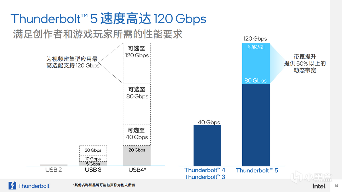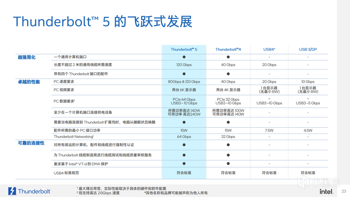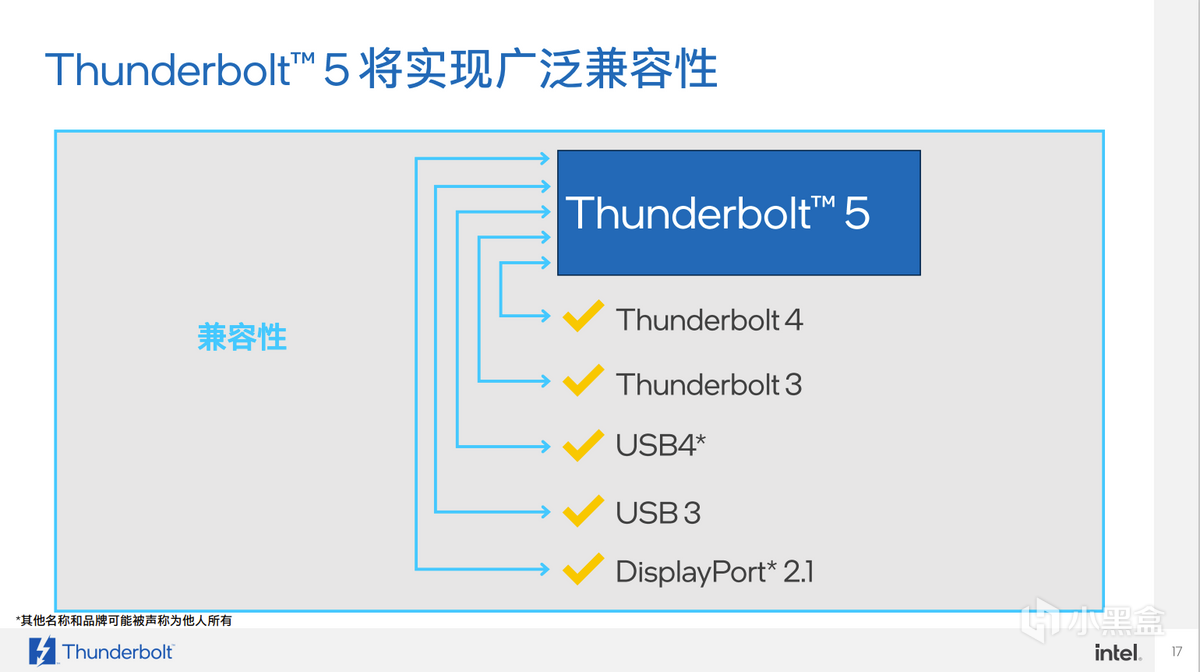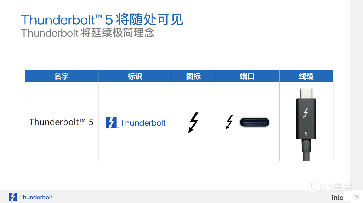因此在2024年正式推出Thunderbolt 5時,英特爾除了提供數字“5”的標識之外,還會新增一個藍色背景正方框的Thunderbolt標識,用於強調這是高性能的Thunderbolt 5。