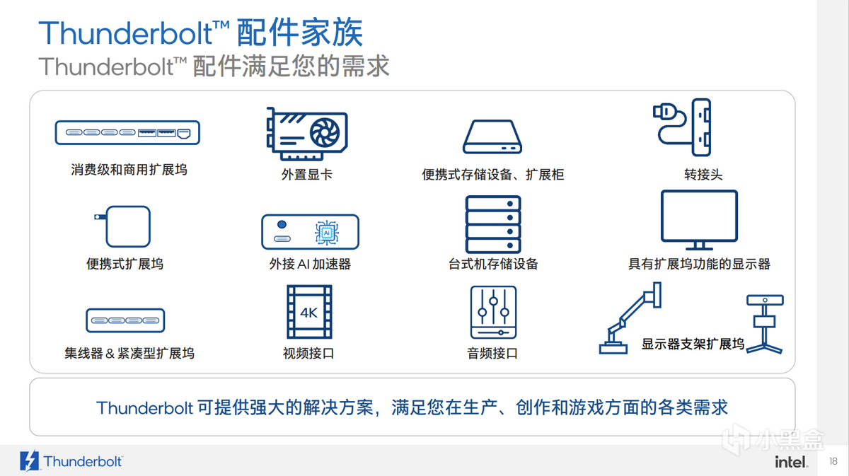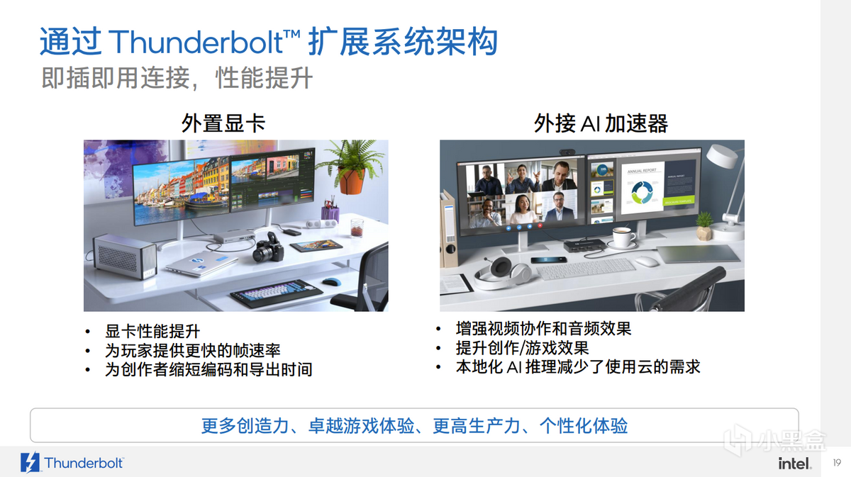 與此同時,Thunderbolt 5也會將討論已久的外置顯卡擴展,以及最新的外置AI加速器擴展加入到Thunderbolt 5擴展系統架構中。讓筆記本能夠同時兼顧移動和桌面高性能擴展的兩種特性,這也是高端玩家和內容創作者們迫切需要的。