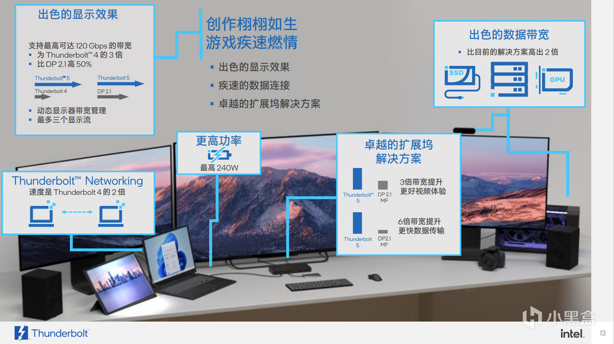 在英特爾Thunderbolt 5使用場景的設定中,無論是高端移動工作站還是高性能遊戲本,也能從Thunderbolt 5直接受益,因爲過去擴展可能需要電源、Thunderbolt 4兩根線纜實現。但到了Thunderbolt 5,一根線纜就能解決問題。因此引出了Thunderbolt 5另外一個重要特性,即最高支持240W的PC充電!