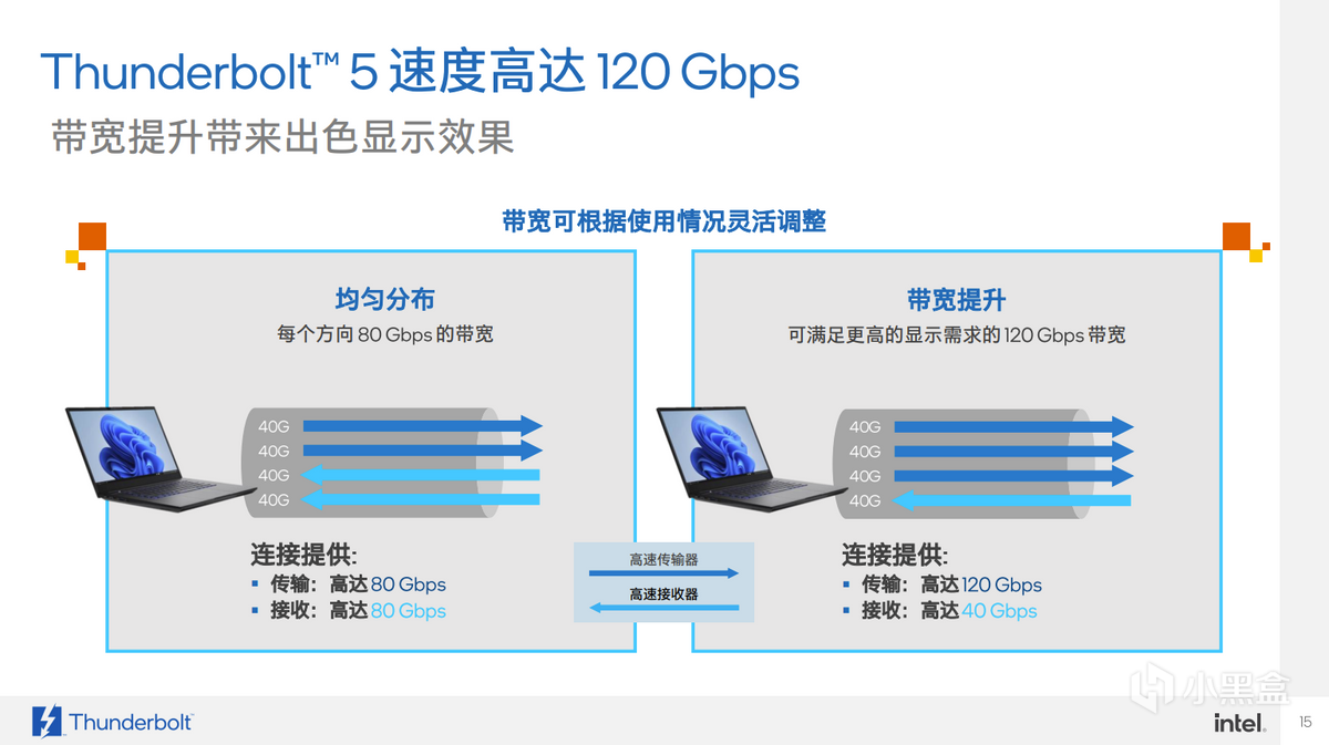 英特爾在演示中用了更形象的例子,在Thunderbolt 5中,單通道的速率分配爲40Gbps,包含高速傳輸器和高速接收器兩個方向,每個方向佔2個通道,即雙向80Gbps速度。這時候只需要將其中一條通道改變傳輸方向,單向實現120Gbps。英特爾也強調,動態通道本身是可以根據系統需求自動調整的,不需要人工干預,確保了很好的使用體驗。