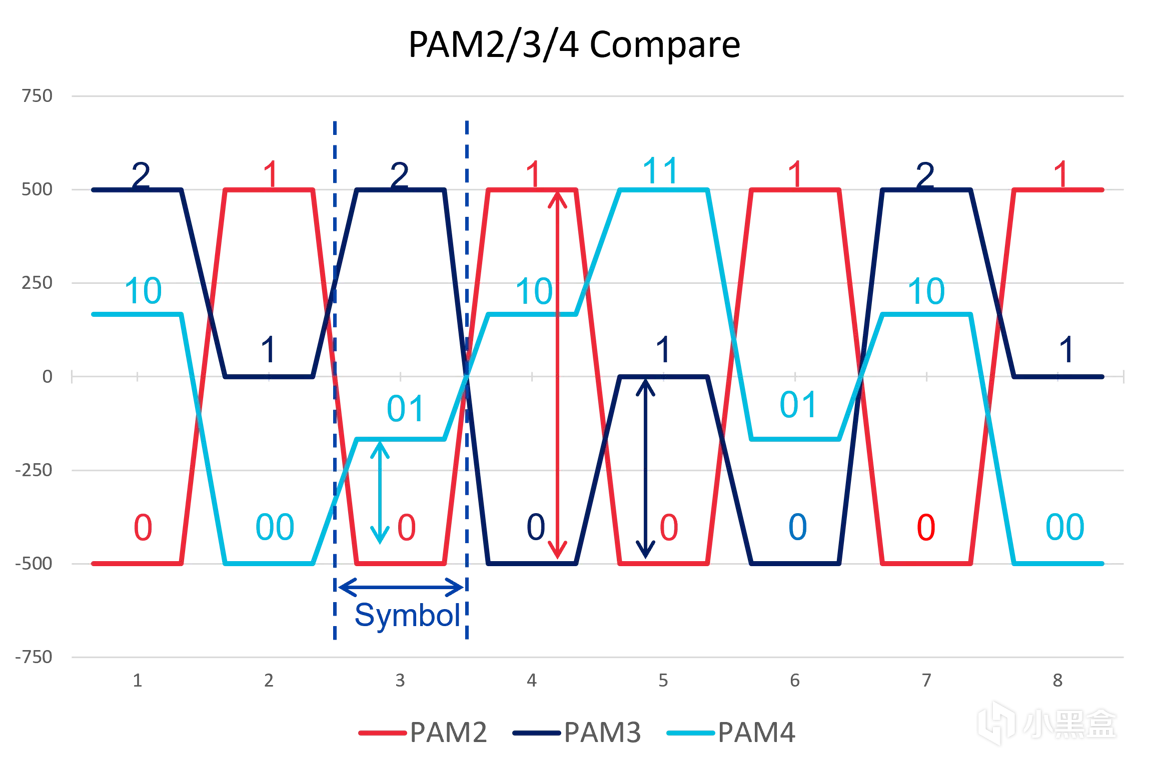 PAM全稱Pulse Amplitude Modulation,即脈衝幅度調製,PAM後面跟隨的數字代表可以表現出多少個電平,例如PCIe 6.0和NVIDIA GeForce RTX 30系列以後GPU使用的GDDR,均使用了PAM4,即4電平脈衝幅度調製,原本只能展現0或1兩種電平信號進而變成展現00、01、10、11等4個階段。