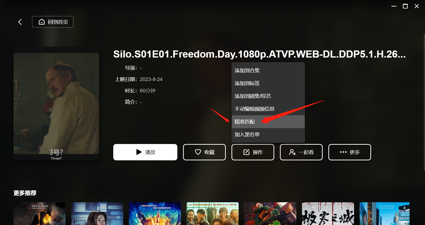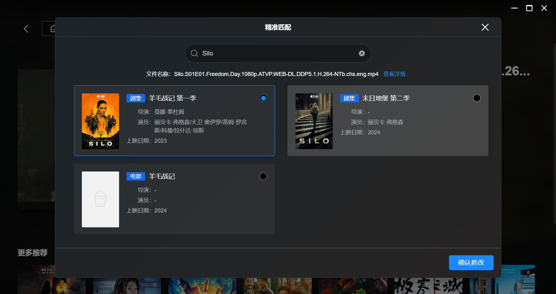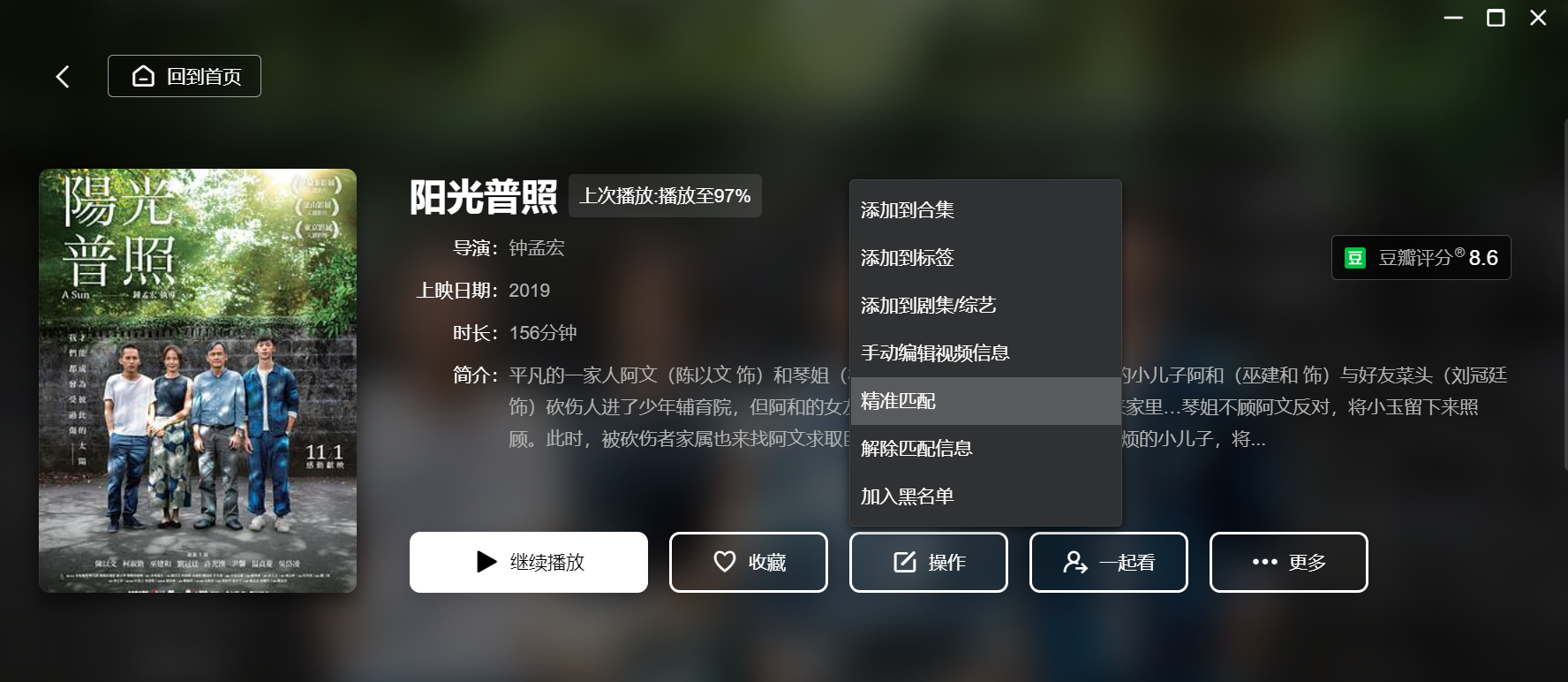 到這裏我必須誇一誇綠聯雲影院的刮削器,由於一些影視資源下載時,本身文件的命名不規範,所以系統在匹配海報等信息時有概率對應不上。這時候我們可以自己進行“精準匹配”,在資源詳情頁面點擊操作-精準匹配,輸入正確的影視名稱搜索即可,一般豆瓣上有的資源都能夠搜索到。