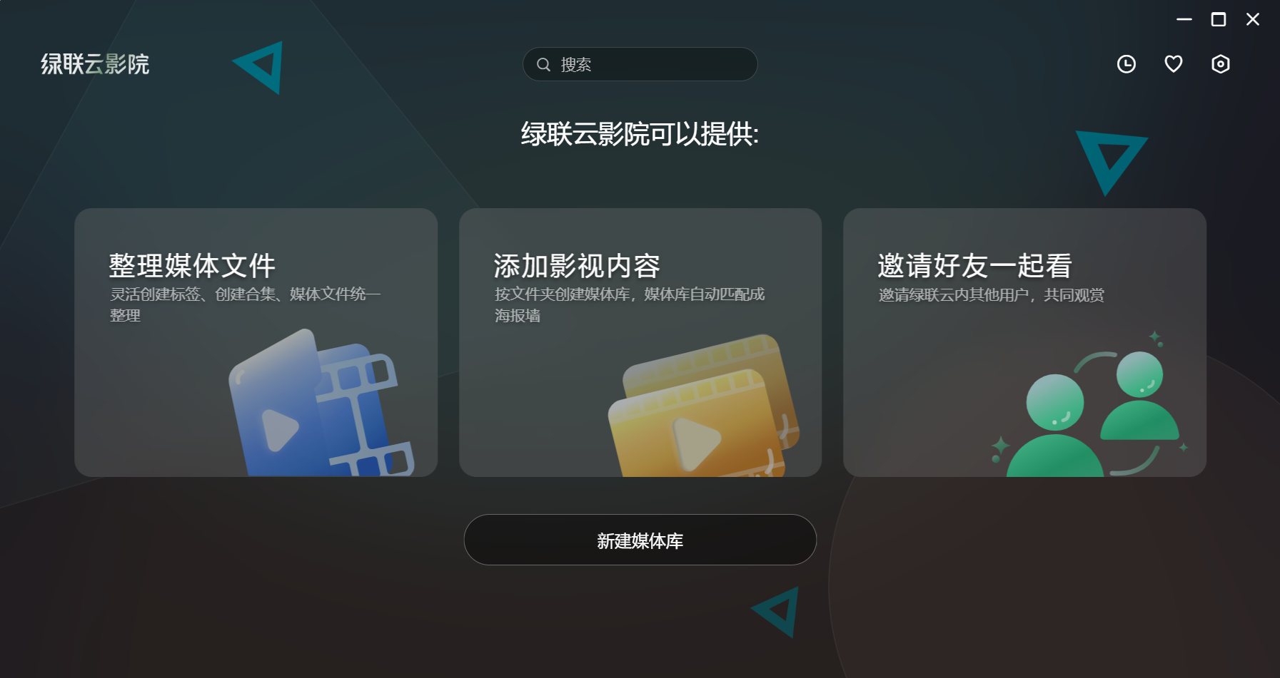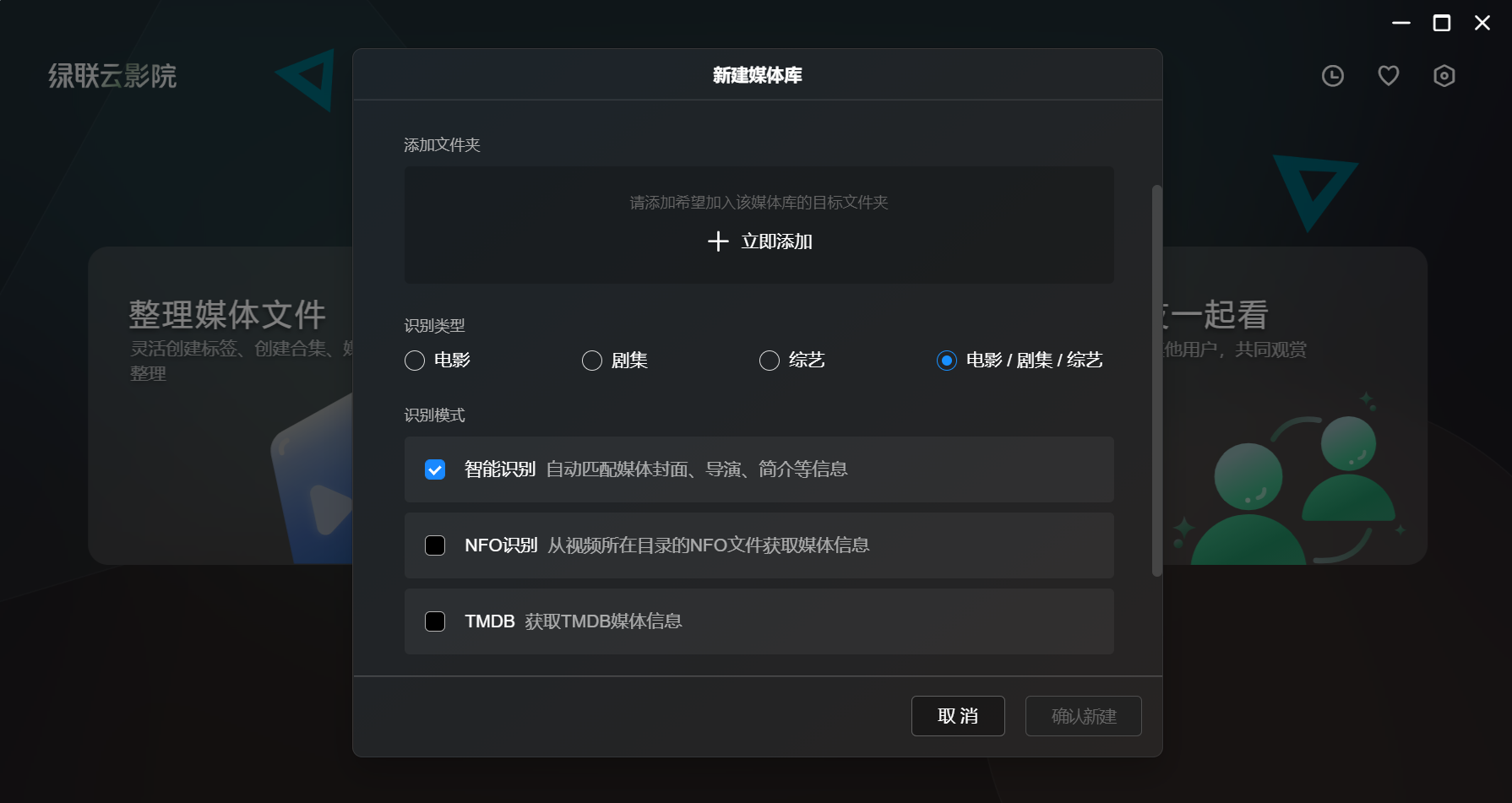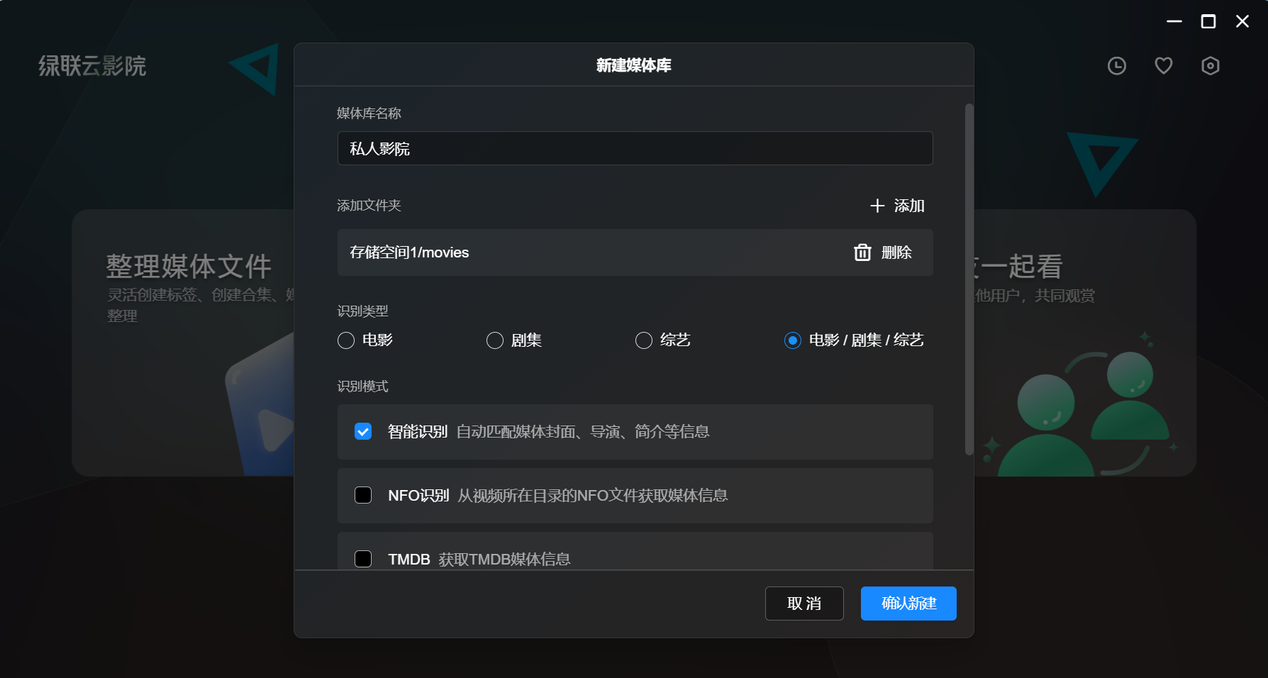 綠聯雲影院的設置和Plex、Emby、Jellyfin這些比起來簡單的不得了,第一次打開套件,我們只需要新建媒體庫即可。