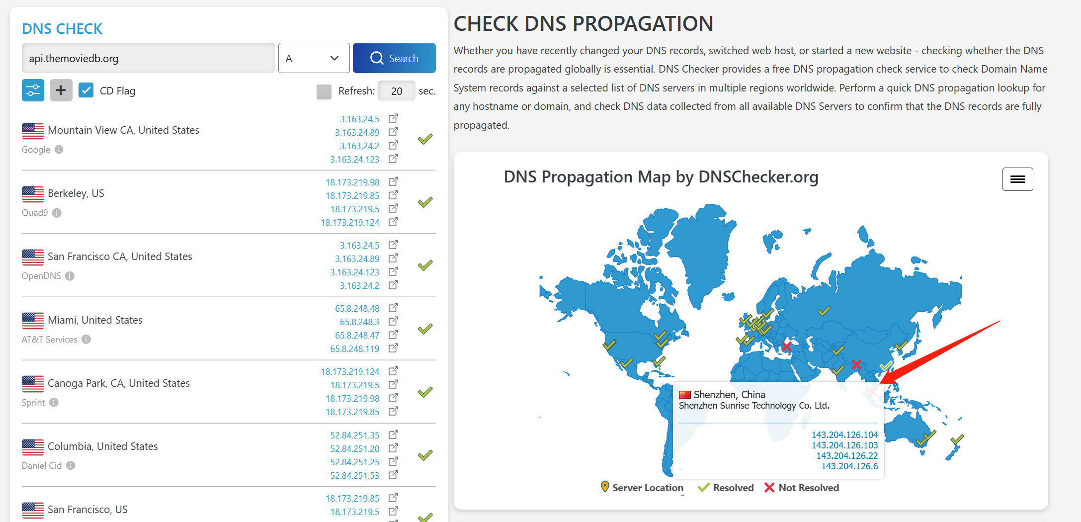 在DNScheck網站上搜索api.themoviedb.org的服務器IP,複製我們國家的DNS地址。