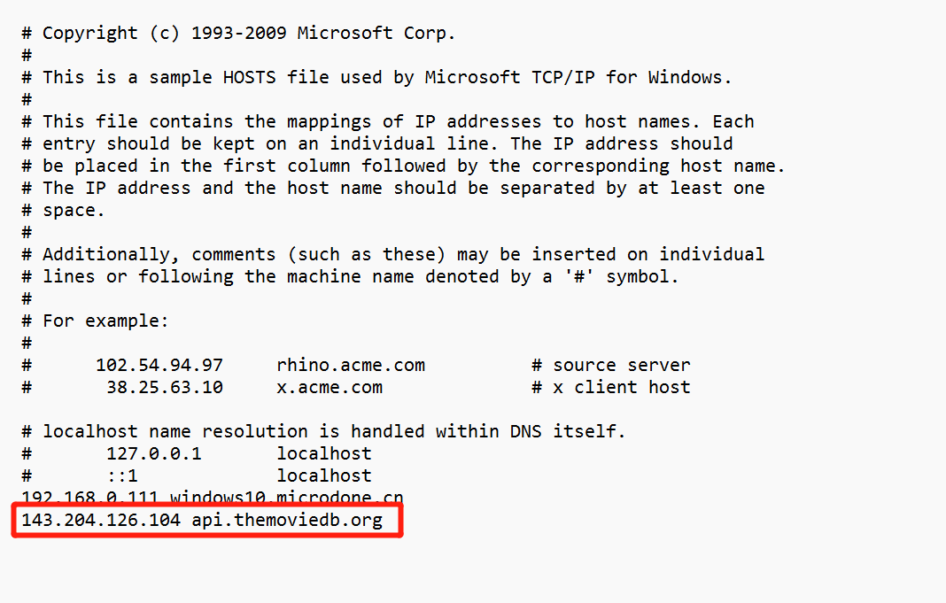 找到電腦C盤中的hosts文件(用管理員權限打開目錄:C:\Windows\System32\drivers\etc),使用記事本打開,在文檔的最後加入一行:143.204.126.104 api.themoviedb.org,保存即可(不是管理員權限打開不能保存)。搞定!