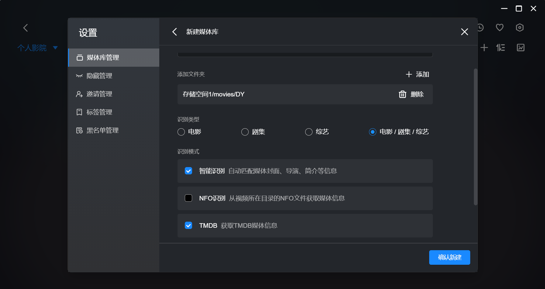 把你存放電影or電視劇的文件夾添加爲媒體庫即可,你可以把電視劇和電影放在同一個文件夾,識別類型選擇電影/劇集/綜藝;也可以把電影、電視劇放在不同的文件夾,設置電影or劇集or綜藝。後者在海報牆信息中會區分不同的項目,方便查找內容。
