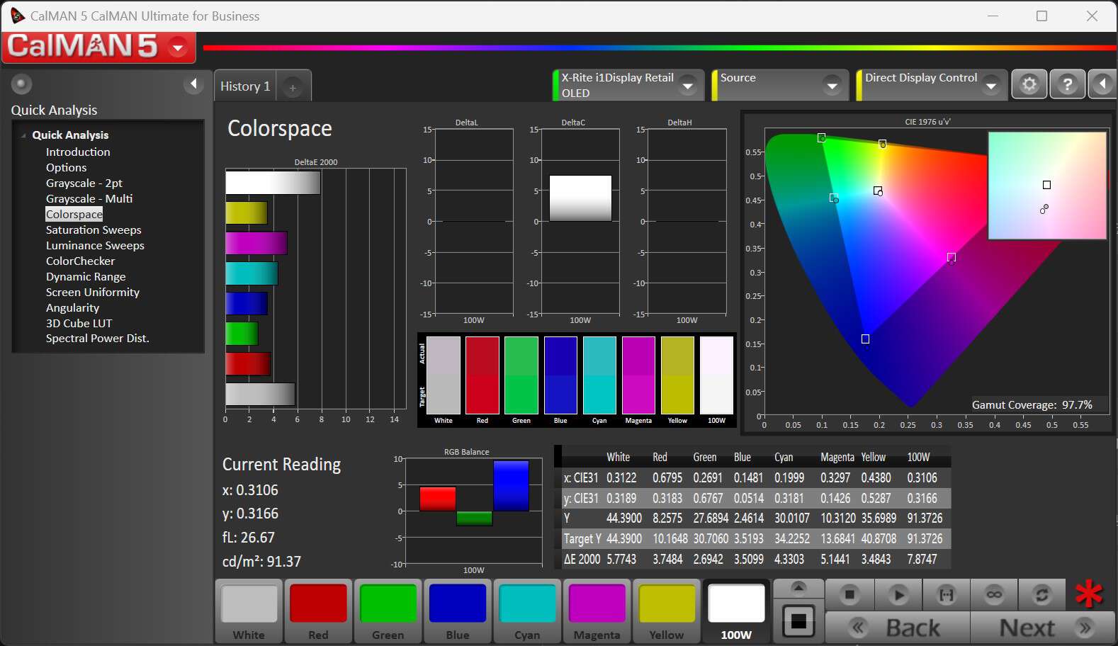OLED因其自身特性,能够更容易获得更好的色域覆盖、色域容积表现。LG 77C3 拥的色域表现非常优秀:97.7%的DCI-P3色域覆盖。观感上LG 77C3 的色彩表现力很强,画面艳丽,玩游戏的时候非常讨好眼球。