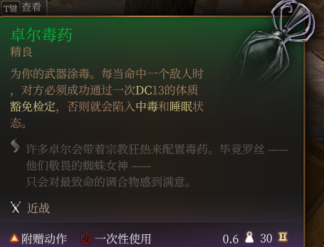 我们知道,中毒的生物发动攻击检定是具有劣势。因此,近身物理攻击的职业可以一开打就给武器上毒,能够很好的给敌人创造劣势。不过要注意矮人基本都免疫毒性,在打矮人的时候要注意这点。不要吝啬你的药水,随时能捡到买到,只要不浪费,根本用不完的。