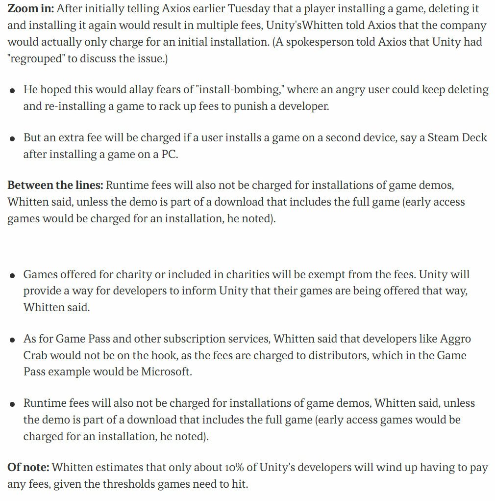 - Whitten 还估计,考虑到游戏需要达到的下载和收入阈值,最终大约只有10%的Unity开发者会被收取费用。