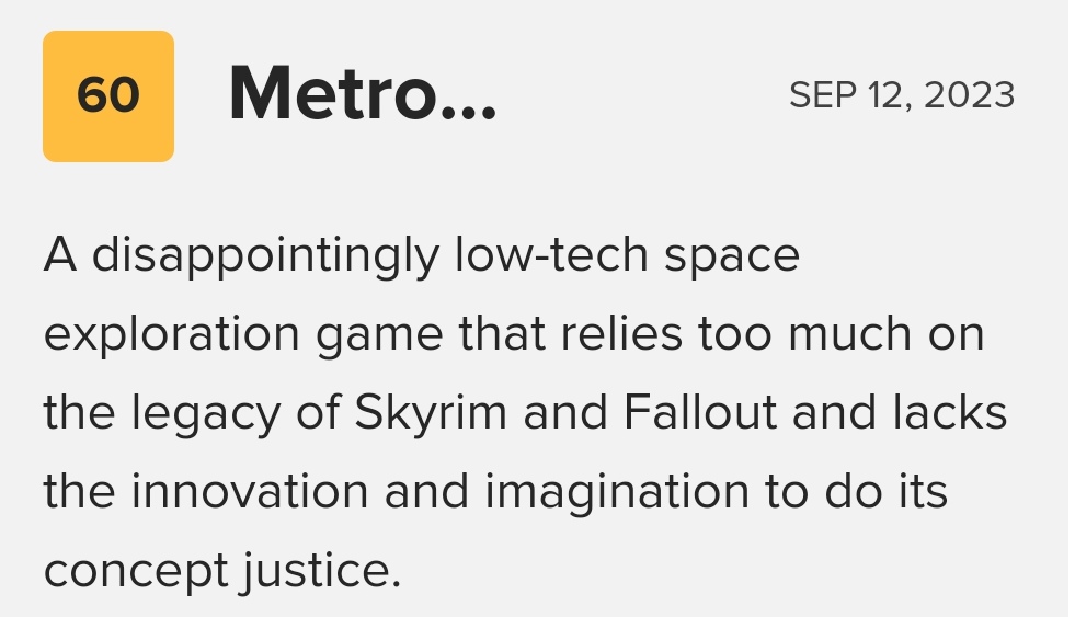 这是一个令人失望的低科技太空探索游戏,过于依赖同公司的《上古卷轴5》和《辐射》,缺乏创新和想象力来公正对待"。