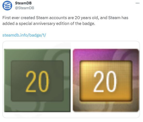 V社旗下游戏平台Steam迎来了20周年的庆典。根据SteamDB的披露,V社已经向首批注册用户派发了独特的20周年徽章。