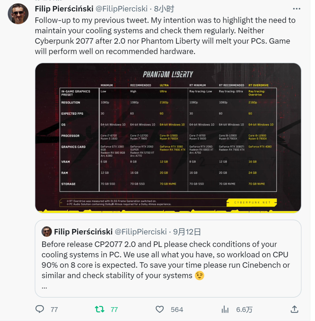 之前,他提到《赛博朋克2077》2.0版对八核CPU的占用率高达90%,因此建议PC玩家要仔细检查自己电脑系统的稳定性,并确保散热系统正常运行。今天他在推特上澄清,他之前的发言只是为了强调玩家需要定期维护自己PC的散热系统,以保持游戏的流畅运行。无论是2.0版本还是资料片,“赛博朋克2077”都能在推荐的硬件配置下良好运行,不会对PC造成任何不利影响。