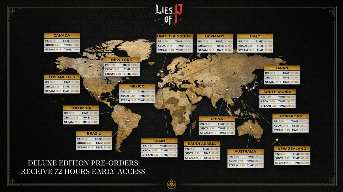 今天(9月13日),类魂游戏《匹诺曹的谎言》宣布了其全球解锁时间表。购买数字豪华版的玩家将提前72小时游玩。具体来说,在Xbox和Steam平台上,游戏将在北京时间9月18日23时解锁,而在PS平台上,则将在北京时间9月19日0时解锁。