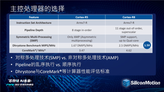为了达到如此高的性能,慧荣SM2508采用了ARMv7-R指令集的两个Cortex-R8 CPU核心,基准性能达2.5 DMIPS/MHz、4.62 CoreMark/MHz。