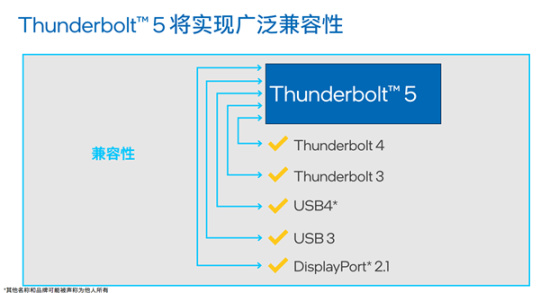 当然,雷电一贯强大的兼容性也必不可少,雷电5不但可以向下兼容雷电4、雷电3,还兼容USB4系列、USB 3.x系列、DP 2.1等各大传输标准,通过扩展坞还可以输出HDMI。