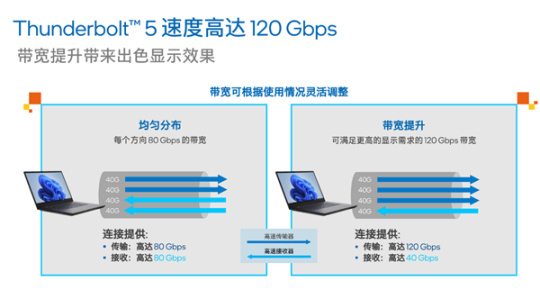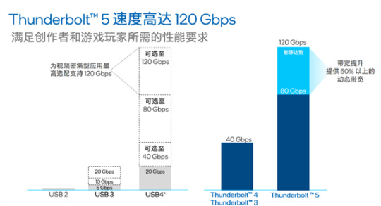 数据方面,80Gbps乃至是120Gbps的带宽可以轻松连接更多、更高性能的SSD、外置显卡等等,而且如前所述,可以灵活配置,使用更加方便。