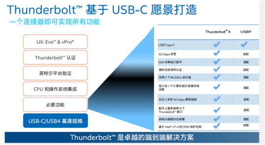 同时,得益于Intel体系化、平台化的优势,雷电4接口还有着CPU处理器与操作系统原生集成、平台验证、雷电认证、Evo/vPro用户体验等方面的独特优势,这都是USB4所无法享受的。