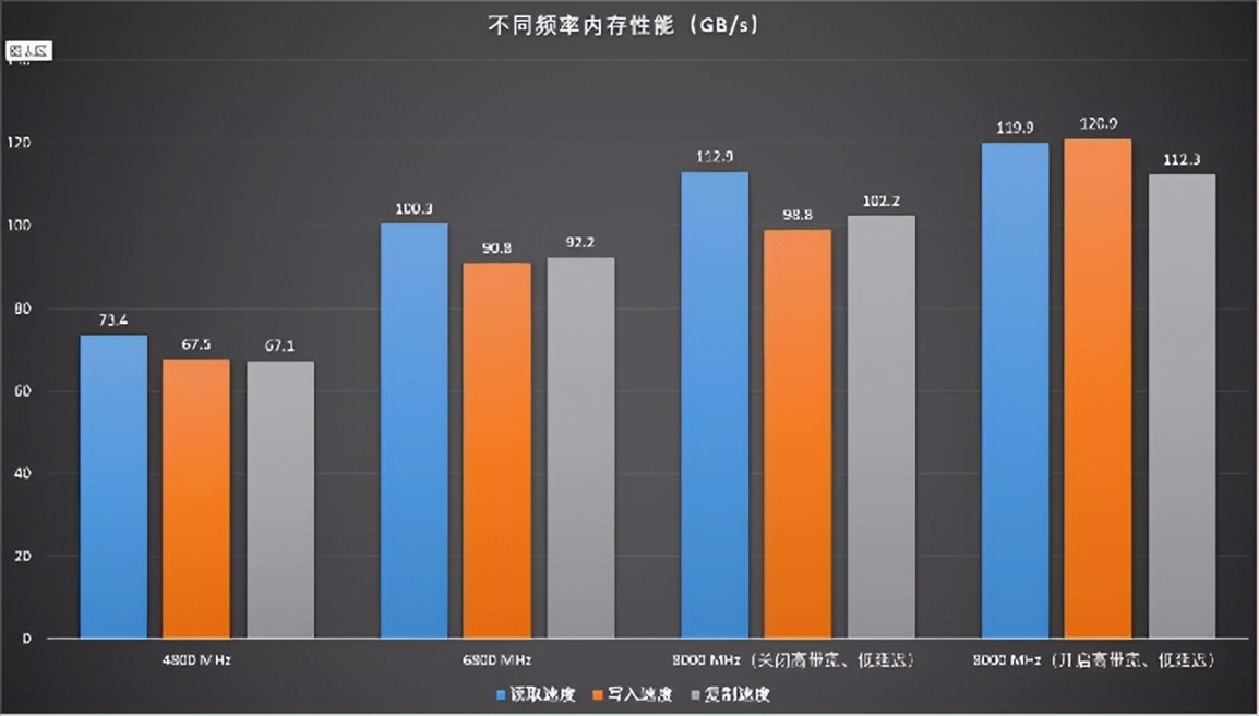在开启了高带宽、低延迟功能后,内存的读写速度约为119.9 GB/s,写入速度约为120.9 GB/s,复制速度约为112.3 GB/s。内存的延迟也从4800 MHz时的83.5 ns大幅度降低到了58.7ns。