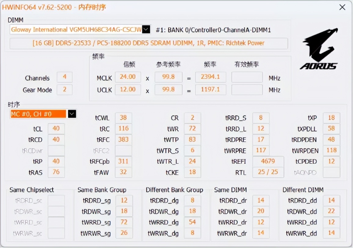 通过HWiNFO64软件可以读出CPU、内存和显卡等硬件的详细参数。在没有开启XMP功能以前,内存默认运行在4800 MHz的频率,这也是当初DDR5内存上市时很多品牌内存主打的频率。