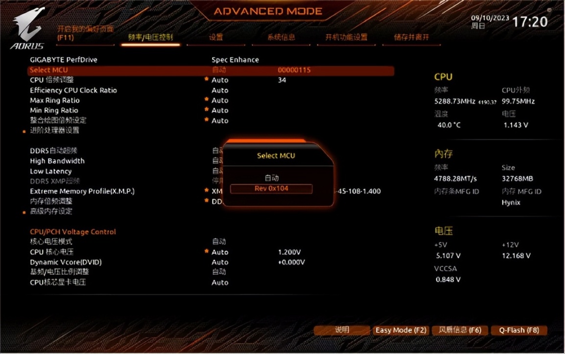 104微码是个很神奇的东西,启用104微码后可以对12/13代的酷睿处理器进行降压设置,把原本CPU很高的功耗进行有效的降低,同时还几乎不会损失性能。B760M小雕WIFI主板开启104微码的方法也很简单, ADVANCED MODE下,在频率/电压控制选项卡,Select MCU选项里,选择“Rev 0x104”后就能开启104微码。