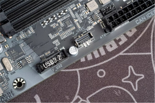 靠近主板电源插槽的位置设计了USB3.2和USB Type-C(USB 3.2 Gen 2)接口,通过连接排线可以把这些接口扩展到机箱的前面板等位置。除了这两个USB扩展接口以外,主板上还提供了4个USB 2.0/1.1接口和2个USB 3.2 Gen1等接口的扩展插座。