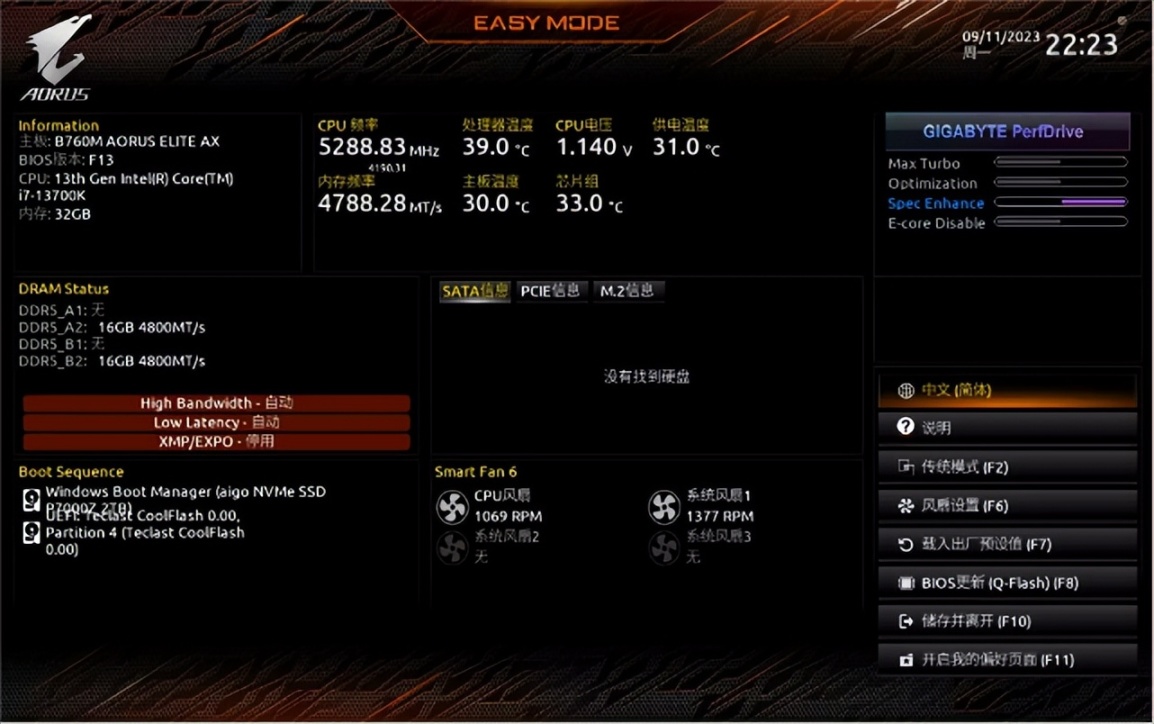 B760M小雕WIFI主板的BIOS界面在细节上设计得很丰富,信息布局也很实用。开机BIOS默认是在EASY MODE下,在这个界面可以了解到主板的型号、BIOS版本、处理器和内存的信息。