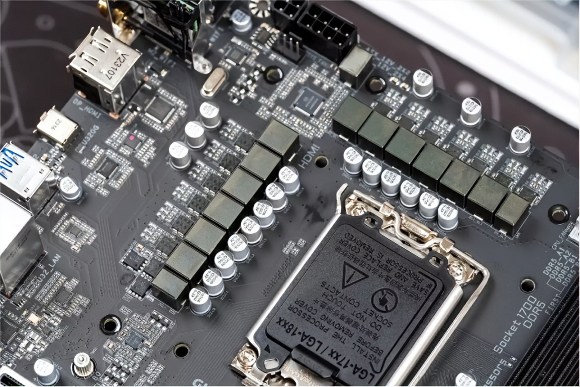 拆掉散热片后可以看清主板在供电方面的配置。这款主板采用了12+1+1相供电,60A的DrMOS可以提供稳定和充足的供电,对内存和CPU等超频有很大的帮助。虽然B760芯片组比不上Z790,但是冲着12+1+1相供电,也是能撑得起i9级别的CPU运行。