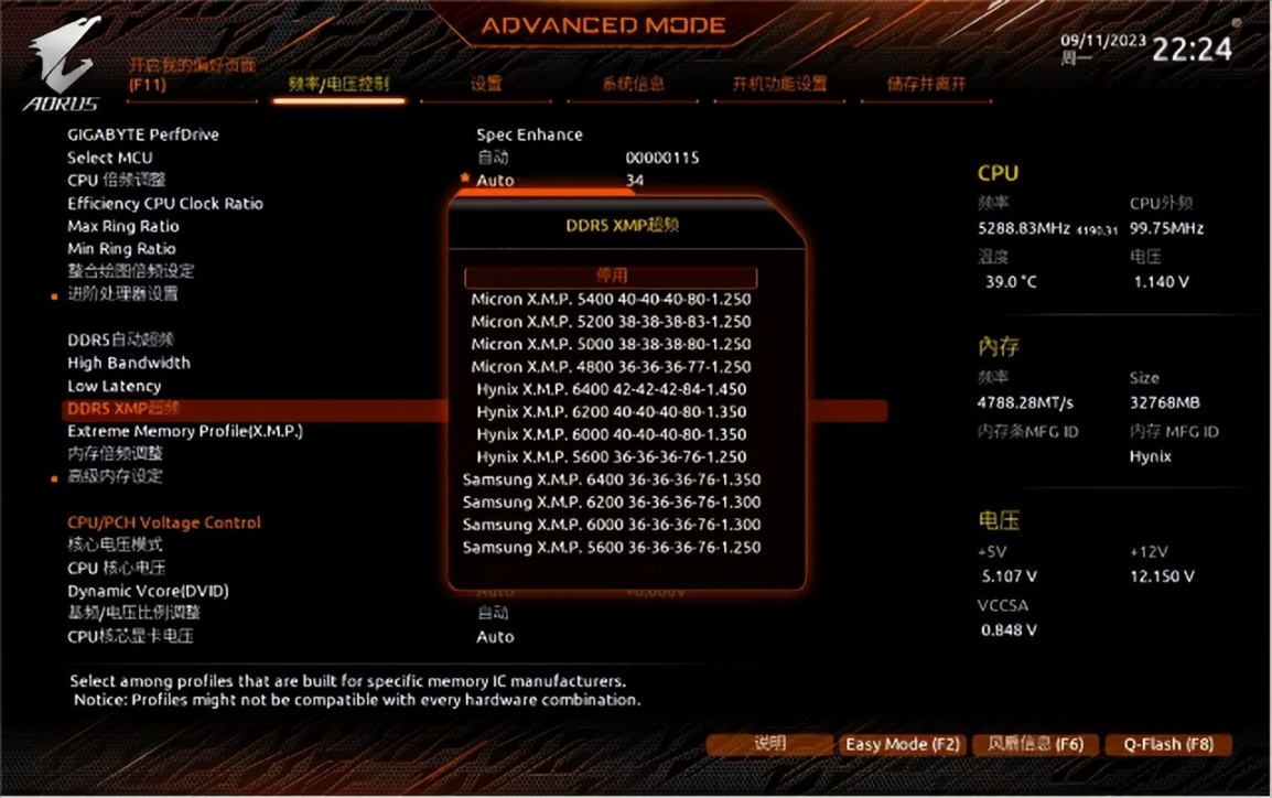 BIOS中内置了DDR5 XMP超频的功能,用户可以根据自己内存的颗粒品牌、制造商等尝试超频。这种超频方式有点碰运气的性质,也不能充分释放内存的性能。