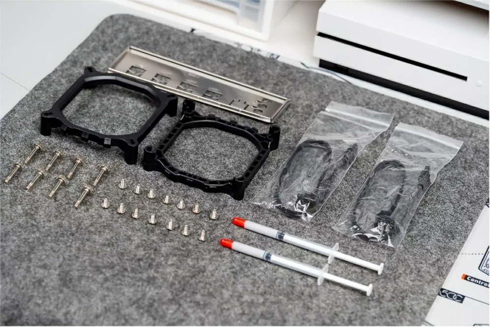 主板附送的配件包括机箱I/O挡板、散热器扣具和螺丝、SATA数据线和两支散热硅脂。