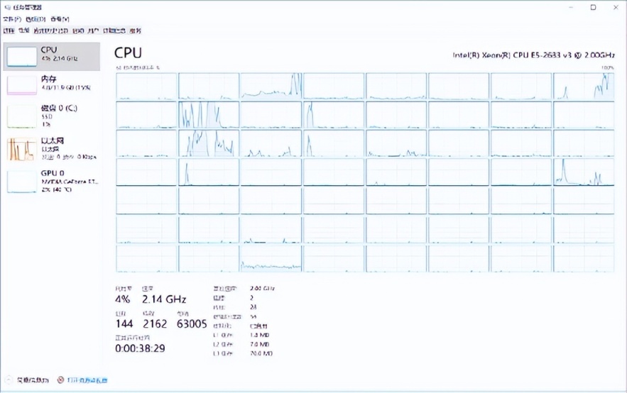 在任务管理器里看到56个框框还是有点激动的,估计很多人和我一样都没见过这么多的CPU核心。