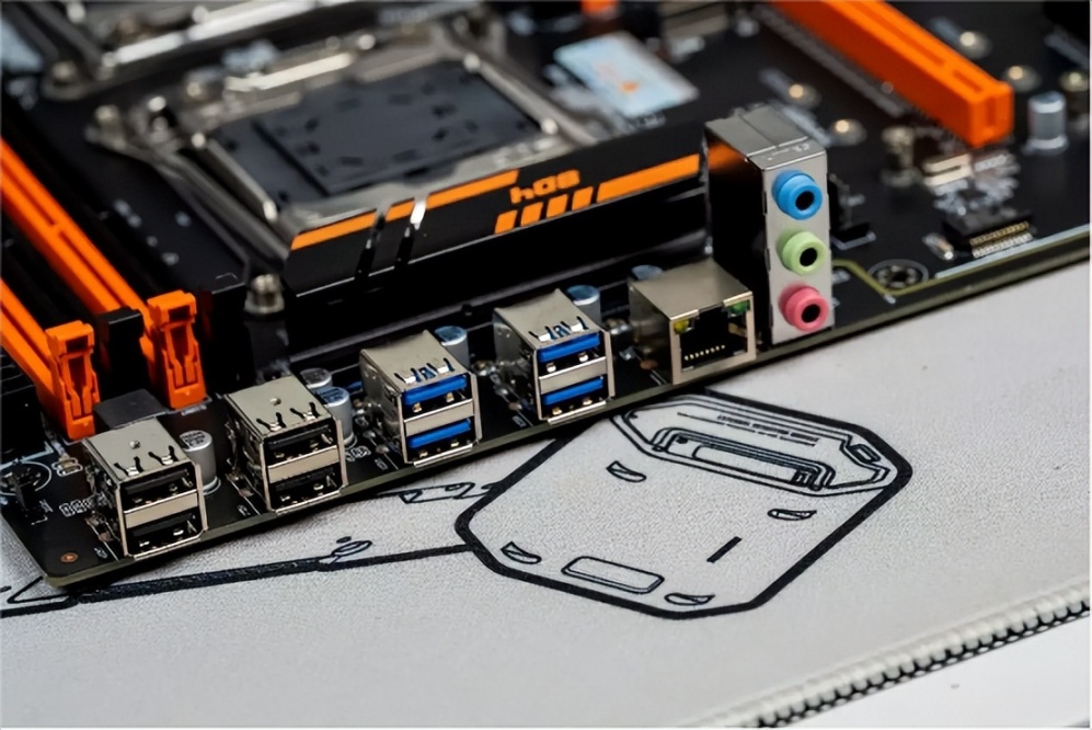 主板背部I/O接口里数量最多的是USB接口,包括四个USB2.0接口和四个USB3.0接口,主板板载了千兆网卡和5.1声道声卡,常规使用基本够用。
