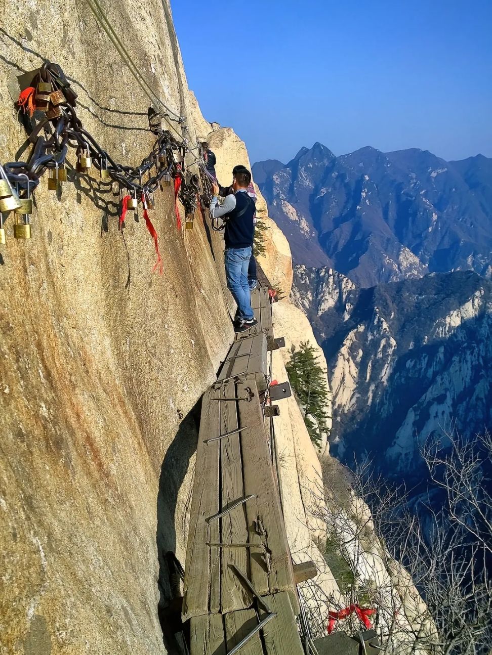 长空栈道是华山中最惊险的景点之一,被称为全球最恐怖栈道,筑在光溜溜的千仞绝壁上,真正接近90度,上望崖壁好几十米,下望至少二、三百米不见谷底,栈道宽仅三十多公分一边空悬并无栏杆,一边崖上钉有铁索可供抓手。踩着30厘米的木板,脚下就是万丈深渊,爬一次够吹一辈子。