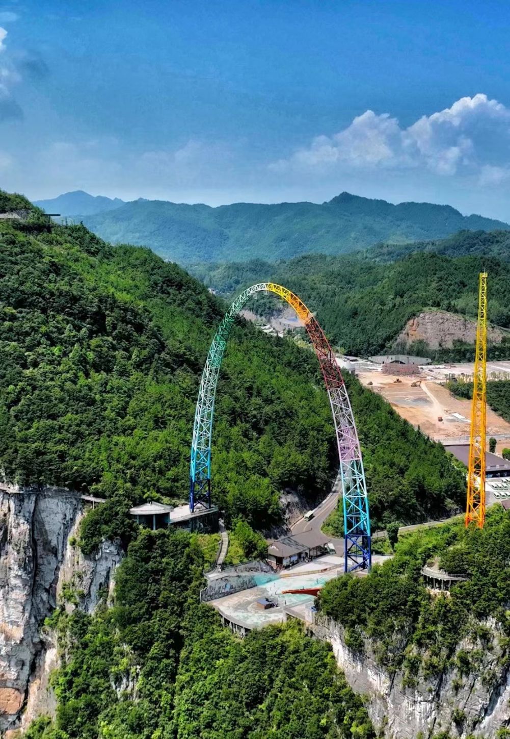 亚洲第一悬崖秋千,由高100米的彩虹涂装拱形秋千主体吊塔,以及108米高的提升发射塔等设备组合而成,仅用一根细绳吊着。100米的高空,以每小时130公里的速度荡出去,直接哭着找妈妈。