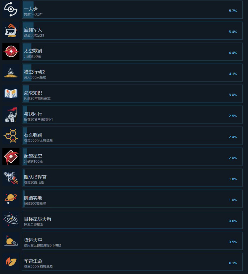 值得一提的是,“一大步”成就不是《星空》中最稀有的成就,比如“目标星辰大海(探索全部星系)”有0.6%玩家解锁,“货运大亨(使用货运链接连接5个哨站)”有0.5%玩家解锁。而“孕育生命(收集500份有机资源)”只有0.1%玩家解锁。