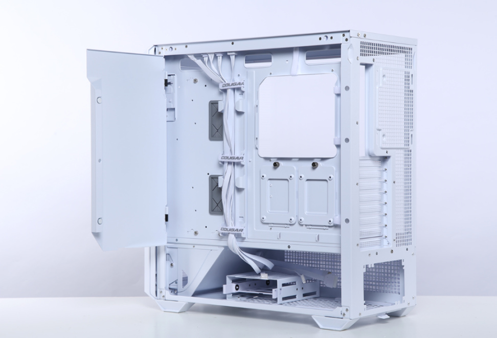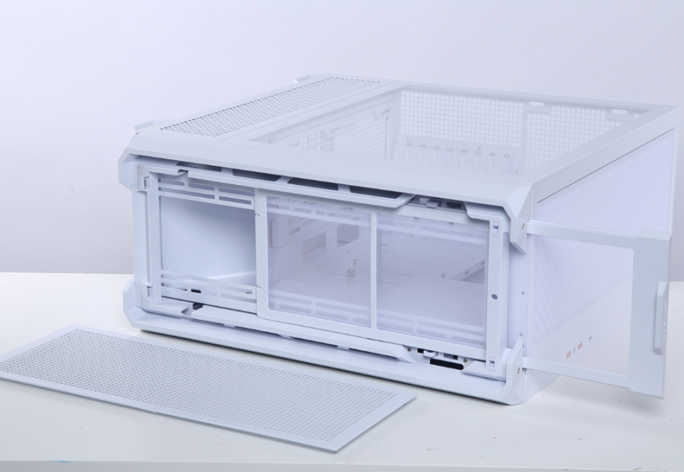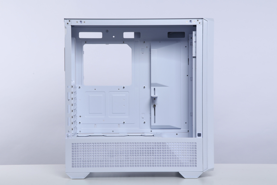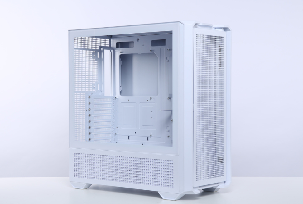 左侧面板采用两段式设计,上面部分是钢化玻璃面板,下面部分是网孔面板,均支持快拆。
