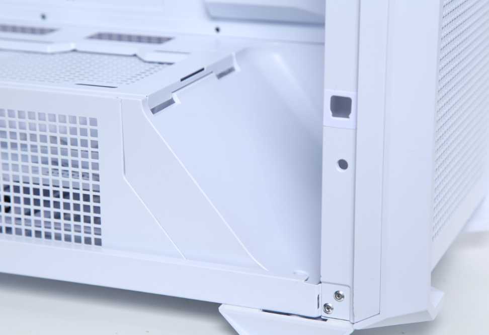 机箱电源仓位置设计也有些小心机,近前面板处有一条风道导流板,可以让前面板底部风扇吹进来的冷风更好的兼顾到机箱内部硬件。电源仓上方风扇位,同样有个可拆支架,对于想要风扇拉满的玩家来讲,这个设计真的非常贴心,大大降低了装机难度。