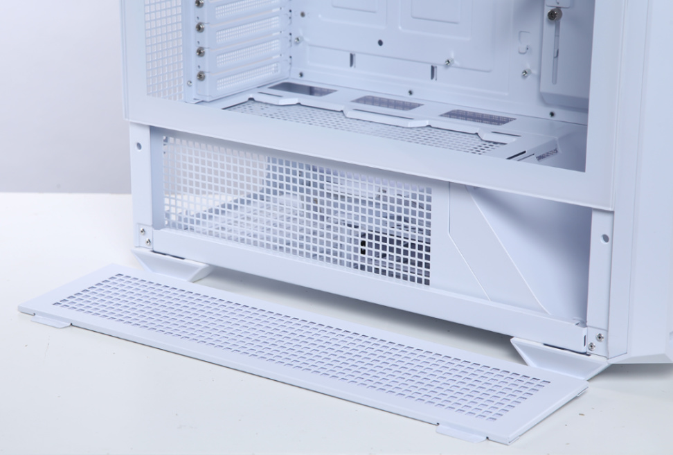 机箱前面板设计非常简洁,是一整块密布方形开孔的金属面板,并通过卡扣方式固定。面板内侧有一块细密的抽拉式防尘网,支持快捷装卸,后期维护也方便。