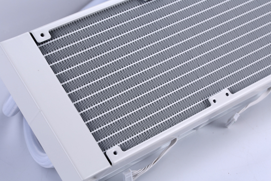白色高强度铝合金冷排,质感满满。内置12条加厚型微水道,搭配上紧密排布的Z字型冷排,高效热交换效率有保障。冷排与水冷管连接处采用高压紧固接头,搭配冷排内置的动平衡泄压囊,可以给水冷带来更安全的使用环境和更长久的使用寿命。